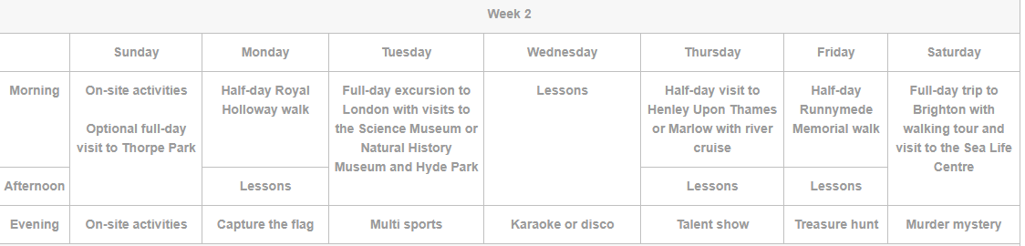 Each 14 night stay will include 2 half-day trips exciting places/cities such as Windsor Castle and Henley Upon Thames or Marlow, and 4 full-day excursions to other major cities such as London, Oxford and Brighton. Transport for trips may be by private coach or public transport.